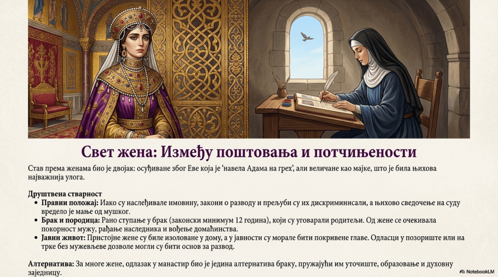 Ретке жене које су проглашаване светим биле су замонашене девице. За младе жене манастири су били основна алтернатива брака. Женама мученим породичним невољама, болешћу или старошћу они су пружали уточиште. Ако би жене напустиле своју породицу да би се замонашиле, оне су се у ствари придруживале другој породици, духовном сестринству манастира под вођстом игуманије. Примањем монашких завета жена је постајала Христова невеста, ступајући у духовни брак и задржавајући своје девичанство. Од жена се у манастирима очекивао известан степен образованости, јер су добијале одговорна задужења.