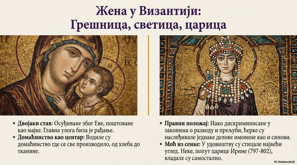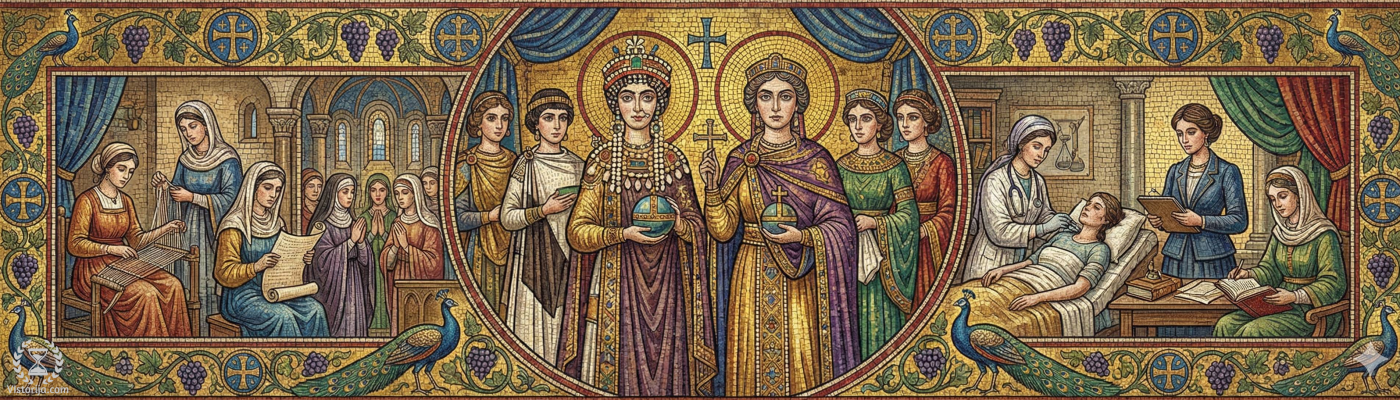 Византијски закон штитио је нека права жена, на пример, синови и ћерке наслеђивали су једнаке делове породичне имовине. Међутим, већи део законодавства (закони о разводу и прељуби) дискриминисао је жене и постављао их у неравноправан положај. Њихово сведочење се сматрало мање поузданим од мушког.
