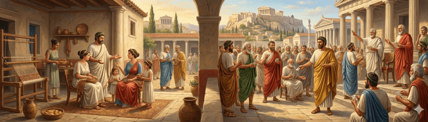 „Тачка ослонца античке Атине померила се са породице на заједницу: ради тога су приређиване величанствене светковине и приредбе и подизана велика јавна здања за верске и политичке потребе. Атински мушкарац проводио је време на агори [тргу], окружен тим здањима. Насупрот томе, његов дом је био сив и неугледан: у демократији није било препоручљиво истицати се начином живота који одудара од начина живота већине. Усталом, мушкарац је живео свој живот у јавности, а не у кући. То је био основни предуслов који је омогућио Атини да постане пример за идеалан тип античког града; подривање породице представљало је цену која је морала да буде плаћена за успешан бег из круга племенских и родбинских веза, а у правцу стварања новог вида друштвеног и политичког организовања.“