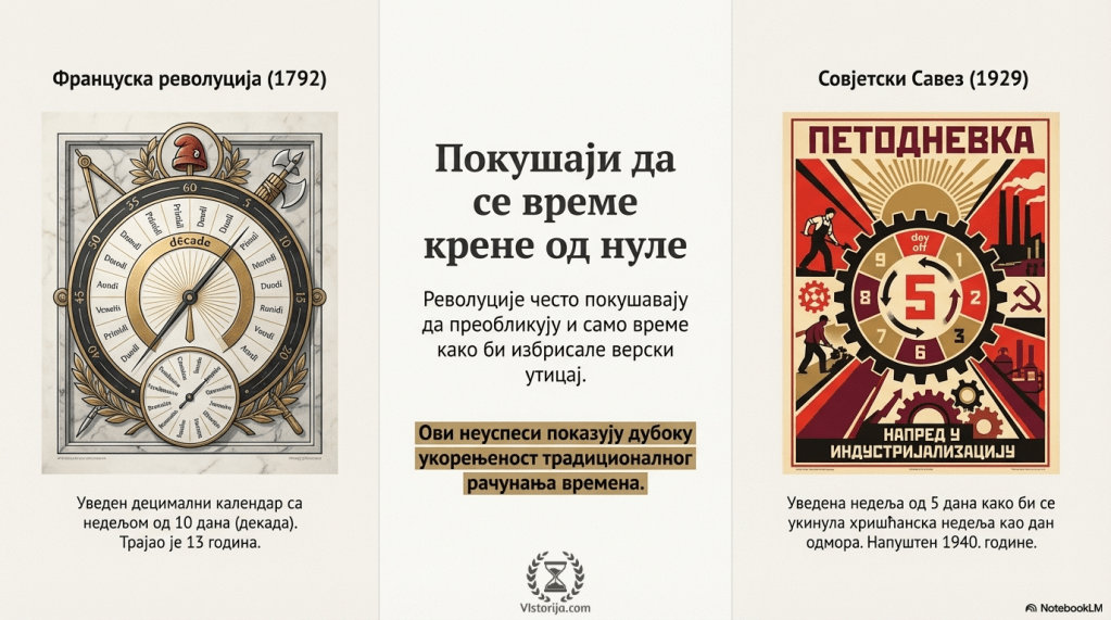 Док многим западњацима календар можда не значи више од система за хронолошко књиговодство, он се показао као једна од најчвршћих људских установа. Та чврстина делимично потиче од моћне мистичне ауре Сунца и Mесеца, а делимично од тачно утврђених граница годишњих доба. Револуционари су често покушавали да реформишу календар, али је њихов успех био кратког даха. Националним споразумом Француске револуције успостављен је одбор за реформу календара – кога су чинили математичари, један васпитач, један песник и чувени астроном Лаплас – који је створио нови календар љупке рационалне историје. Њихов децимални календар је 1792. године заменио седмодневну недељу десетодневном која се звала декада, у којој је сваки дан добио латински нумерички назив, а три такве седмице чиниле су месец. Дан је био подељен на десет часова, од којих је сваки имао по сто минута, а сваки минут по сто секунди. Поред 360 дана дванаест месеци, додатних 5 или 6 дана добили су поучна имена: Врлине, Дух, Рад, Мишљење, Награде, са једним преступним даном који је прозван пролетерски, голаћки празник, а био је посвећен празновању и забави. Овај календар, који је смишљен да олабави притисак цркве на свакодневни живот и мисао, потрајао је несигурно само тринаест година. Када је Наполеон постао владар Француске, он је вратио у употребу грегоријански календар са његовим традиционалним свецима и празницима, за шта је добио благослов од папе.