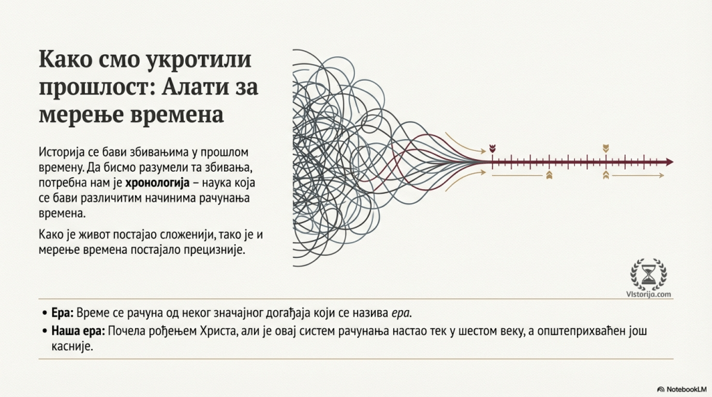 Историја се бави прошлошћу, збивањима у претходном времену. Догађаји се нису дешавали само у неком времену, него и на неком простору и то су фактори који у многоме утичу на догађаје. Немогуће је да се догађаји понове потпуно идентично, јер су околности различите и самим протоком времена (барем стицањем искуства) и променом места. Зато нам је за проучавање историје потребно и познавање географије и хронологије, која се бави различитим начинима рачунања времена у прошлости. Живот је временом постао садржајнији, бржи и организованији, па се и више пажње посвећивало рачунању времена, које је постајало све прецизније и јавно доступније.
