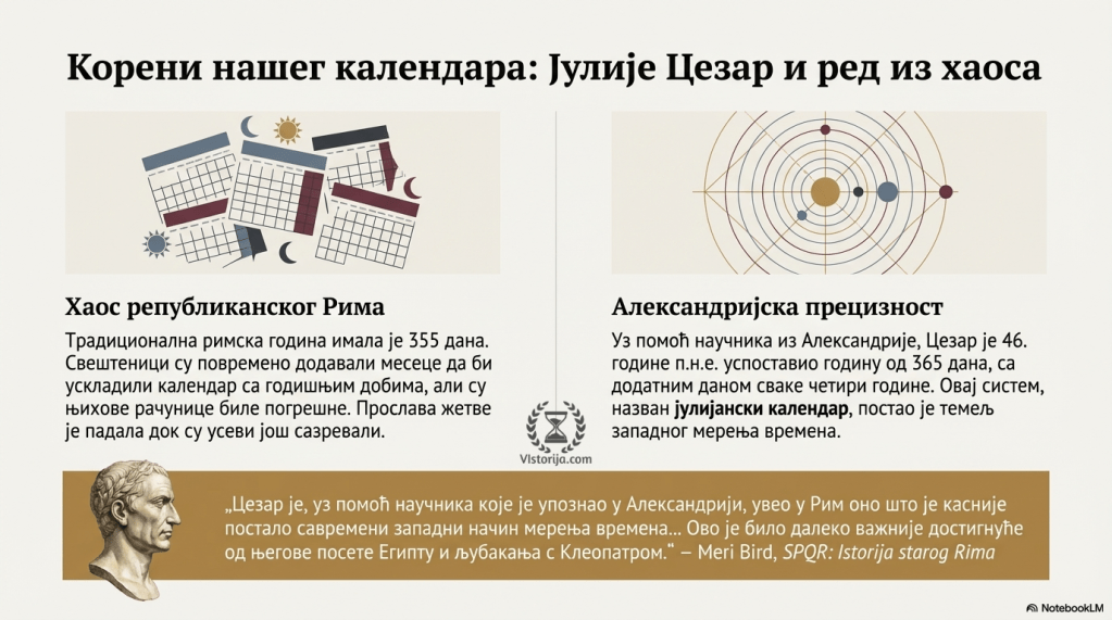 „Цезар је, уз помоћ научника које је упознао у Александрији, увео у Рим оно што је касније постало савремени западни начин мерења времена. Традиционална римска година имала је свега 355 дана, и столећима је дужност римских свештеника била да с времена на време додају по један месец како би грађански календар ускладили с годишњим добима. Из неког разлога, вероватно мешавине недовољне стручности и недостатка воље, њихове рачунице очигледно су биле погрешне. Због тога су се календарска и природна година понекад разликовале за више седмица, па је римска прослава жетве падала у време док усеви још сазревају, а клима у месецу који су звали април више личила на фебруарску (што је и била). Због тога је увек опасно сматрати да датуми у историји Републике тачно указују на временске услове. Помоћу александријског знања Цезар је исправио грешку и успоставио годину од 365 дана, а један дан се додавао фебруару сваке четири године. Ово је било далеко важније достигнуће од његове посете Египту љубакања с Клеопатром.“