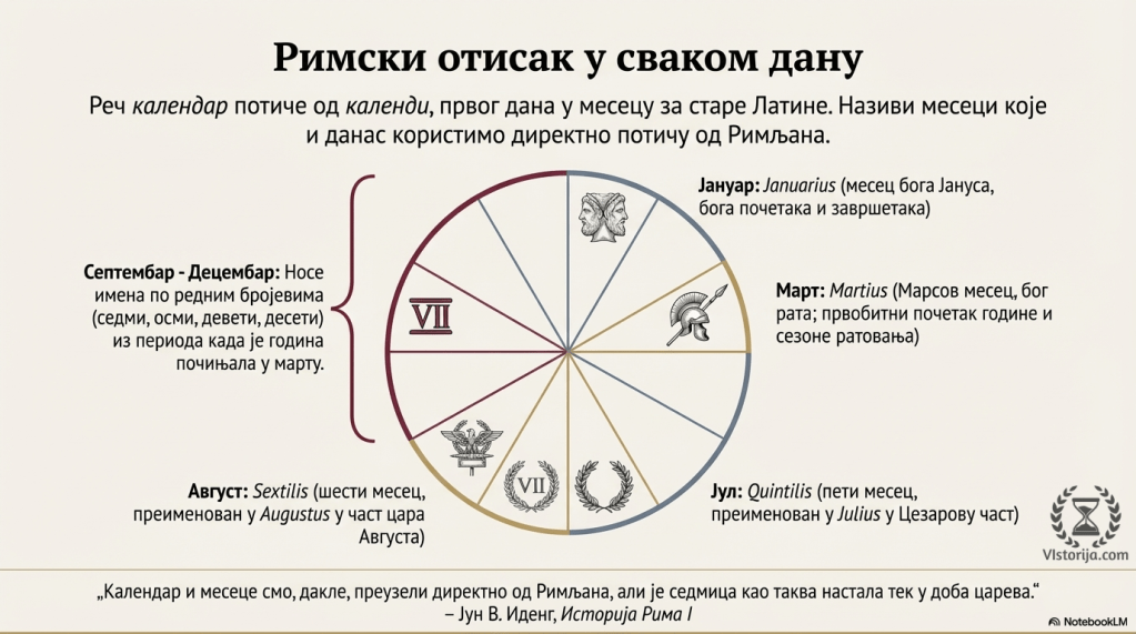 „Календар и месеце смо, дакле, преузели директно од Римљана, али је седмица као таква настала тек у доба царева. У републици се Римљани нису много освртали на недеље, пошто није постојао недељни празник који би требало поштовати, као што постоји у јеврејској, хришћанској и муслиманској традицији. Постојао је недељни циклус од осам дана, који су се у сачуваним календарима обележавали словима А-Н, али имена су добили тек касније, док су празници били распоређени свуда по календару. Обележавао се први дан у месецу (Kalendae), као и 5. или 7. дан (Nonae) и 13. или 15. дан (Idus) – зависно од тога да ли је месец дугачак или кратак. Римски календар није био интернационални календар. Строго гледано, важио је само у Риму и за римске грађане, а сваки самосталан град имао је свој календар. Међутим, пошто је Рим постао велесила, сви су се морали управљати према том граду и његовим навикама, па се и другде пратио римски календар уз локалне. То је било важно зато што је римски календар диктирао које су активности могуће за Римљане у Риму, може ли се трговати, да ли заседају скупштине и судови или је празник. Празници су у римском календару били означени као dies festus и тада су се славили одређени богови.“