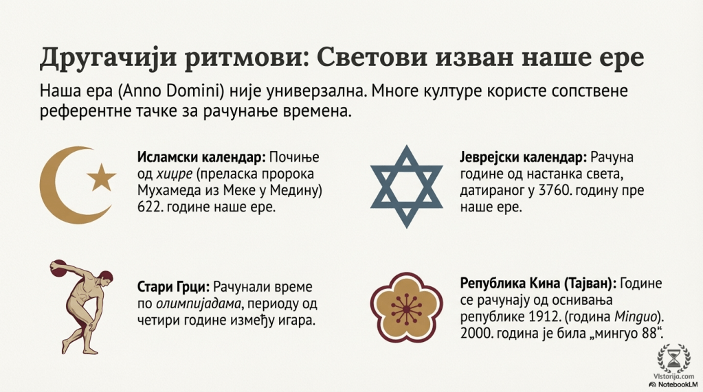 Нису сви одувек рачунали време као данас. За почетак, нису могли године рачунати од рођења Христа пре него што се Христ родио. Нису ни желели, они који нису хришћани, а таквих је на планети много, да рођење Христа узимају као најважнији догађај у историји. Чак и међу хришћанима начин рачунања времена од рођења Христа настао је тек у шестом веку, а општеприхваћен још касније. Такво рачунање времена отпочео је италијански монах Дионисије Мали, прекинувши римско рачунање времена од доласка на власт цара Диоклецијана, који је прогонио хришћане. Нови начин рачунања времена прихватио је франачки цар Карло Велики, који је живео у осмом и деветом веку. Муслимани време рачунају од хиџре, односно преласка (сеобе) пророка Мухамеда из града Меке у град Медину, 622. године наше ере. Разни народи у прошлости су имали, а неки још увек имају, своје начине рачунања времена. Па и у Србији данас држава има један начин, а црква други, јер је задржала јулијански календар, назван по римском владару Јулију Цезару, за време чије владавине је настао.