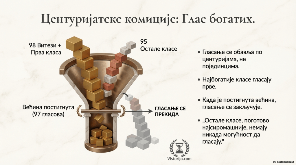 „Мада је у Риму систем теоријски демократски, он у пракси не омогућава сваком грађанину да се изрази. Гласање се, наиме, обавља два пута: најпре у оквиру сваке центурије или сваког племена обави гласање којим се добије већина, а затим, када се гласа на комицијама, свака центурија или племе имају само један глас. А гласање се закључује чим је постигнута већина, чак и ако сви представници центурија или триба нису стигли да се изјасне.