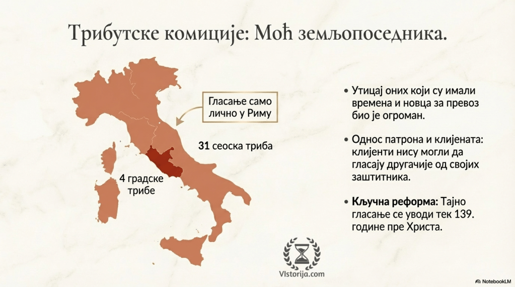 У трибутским комицијама се такође рачуна само један глас по племену, а они који могу да дођу у Рим (који је једино место на којем се гласа) и гласају, свакако не спадају у најсиромашније. Уз то, ако неко сеоско племе нема представнике, магистрат који председава гласањем може да именује замену, коју одабере по свом нахођењу!