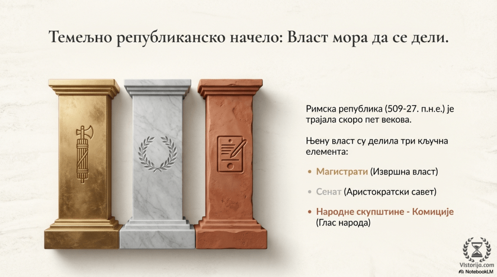 Темељно републикански начело је било да власт мора да се дели. Тако се избегавало да држава зависи од појединаца недостојног власти, као што се дешавало у Риму за време неких краљева, док последњи није протеран. Власт у римској републици су делили магистрати, Сенат и народне скупштине (комиције), којих је у Риму такође било више врста.
