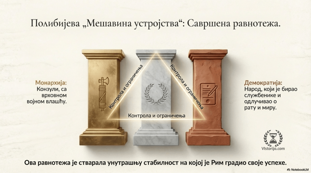Тајна је, каже Полибије, у осетљивом односу контроле и ограничења између конзула, сената и народа тако да никада не превлада ни монархија, ни аристократија ни демократија. Конзули, на пример, можда имају пуно, монархистичко заповедништво у ратном походу, али народ прво мора да их изабере, а финансирање је зависило од сената – а сенат је одлучивао хоће ли успешном заповеднику на крају похода бити додељен тријумф, док је народ морао да одобри сваки споразум који је можда склопљен. И тако даље. Та равнотежа и контрола унутар политичког система, тврдио је Полибије, стварала је унутрашњу стабилност на којој је Рим градио своје успехе.“