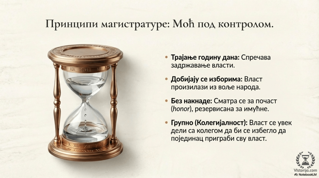 „У доба Републике магистратуре трају годину дана, добијају се изборима и хијерархијски су подељене. Осим тога, обављају се без накнаде (то је почаст) и групно, да би се избегло, чак и на највишем нивоу, да појединац приграби сву власт. Сваке године се на комицијама обављају избори на којима се одређује ко ће управљати пословима Рима. Тако нико не може да задржи власт дуже од годину дана и потребно је да прође неколико година пре него што може да конкурише за вишу функцију. Јер, кандидат мора да прође „пут почасти“ (cursus honorum) који га води од најнижих функција до врховне власти, путем који, после сваке етапе, постаје све краћи. Дакле, учињено је све да би се спречила жеља за личном влашћу. У Риму је магистрат, кога је изабрао народ, само његов представник, који влада у његово име и често, по престанку функције, том народу мора да положи рачуне. Најзад, да би неко могао да следи тај пут стицања угледа, морао је бити грађанин без физичких недостатака (јер се то сматрало лошим предзнаком), да је десет година служио у војсци и да није био осуђиван.