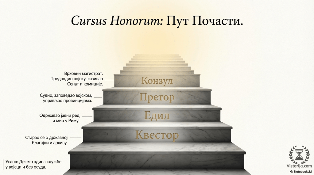„Каријера успешног Римљанина који је припадао друштвеној елити текла је одређеним редом: квестор, едил, претор и конзул. Постојао је и старосни минимум за сваку магистратуру; притом, треба имати у виду да је сразмерно мали број квестора могао постати конзул. У ретким случајевима, на крају каријере, ислужени конзул постајао је цензор. Положај конзула и уопште сваког магистрата представљао је почаст: магистратуре нису биле плаћене, па су, самим тим, биле предвиђене за људе вишег друштвеног сталежа.“