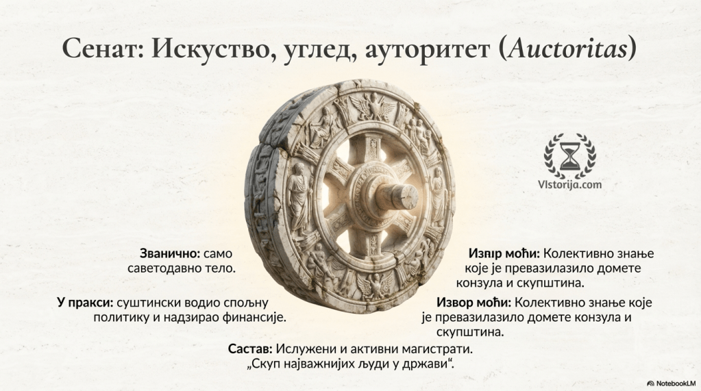 „Сенат, аристократско веће које су чинили представници најзначајнијих породица, било је нека врста саветодавног тела. Сенат је постао, како је време одмицало, тело које су чинили ислужени и активни магистрати, док је у краљевској епоси било састављено од најугледнијих аристократа, нека врста скупа најважнијих људи у држави. И током републике порекло сенатора у огромној већини је било аристократско, мада формално „племенито порекло“ није било услов да би неко постао сенатор. Како је Сенат била стара институција која је окупљала искусне људе, чије колективно знање о државној управи, политици или текућим проблемима јесте превазилазило домете двојице конзула, као и скупштине, Сенат се у држави наметнуо превасходно својим ауторитетом, знањем и угледом.“