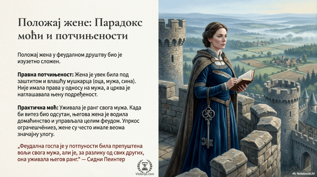 „Положај жена у феудалном друштву био је изузетно сложен. Пошто није могла да се бори, жена је према раном фе удалном обичају, била увек сматрана мање значајном. Увек се Налазила под заштитом неког мушкарца. До удаје би била на очевој бризи, а после би прешла под мужевљену власт. Када би јој умро муж, долазила би под заштиту његовог сениора или свог најстаријег сина. Није имала никаквих права у односу на свог мужа, тако да су њена личност и имовина били у потпу ности под његовом управом. И мада је црква настојала да умири бруталност мужева према женама тако што је ограничавала величину батине којом су их тукли, њена учења нису побољшала положај жене. Жена је за њу била извор свих зала: Евин грех је проузроковао прогон човека из раја. Сама жена је била крхка лађа препуштена пучини греха. При томе је црква ис-трајавала на жениној подређености мужу. Но, пре него што не станемо да претерујемо оплакујући положај жене у рано феудалној епохи, ваљало би да га упоредимо са положајем жене у другим савременим друштвима. Муслиманке су биле затворе не у харему под надзором евнуха, док су византијске племкиње биле мало слободније. Феудална госпа је у потпуности била препуштена вољи свога мужа, али је, за разлику од свих других, она уживала његов ранг. Кад би витез био одсутан, његова жена је водила домаћинство и управљала феудом. Тако су, упркос поменутим ограничењима, жене могле да имају, и често су имале значајну улогу у феудалном друштву.“