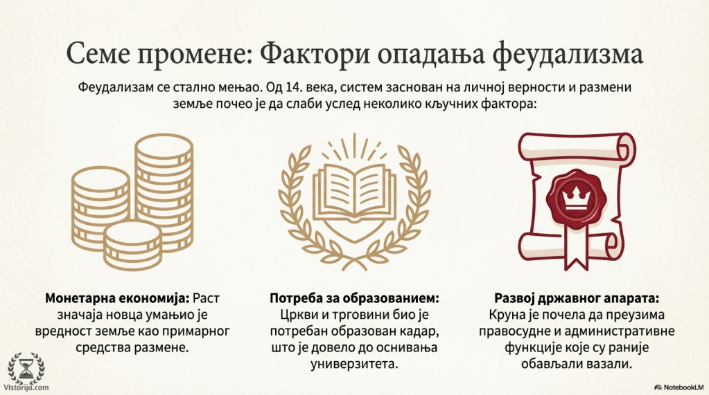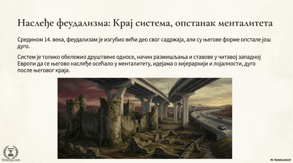 Ма колико сложена била друштвена структура заснована на личном обавезивању појединаца, она је била једино што је до XIV века држало државе на окупу. Потом је постепено почео да се развија модернији државни апарат који је мало-помало преузимао власт и правосудне функције које су дотад обављали вазали различитог ранга. Феудализам се стално мењао. Средином XIV столећа већ се изгубило много од његовог садржаја, али су форме опстале још дуго. Феудализам је настао у одређеним материјално-политичким условима и толико је обележио друштвене односе, али и начин размишљања и ставове у читавој западној Европи, да су се они примењивали и кад више није било поменутих предуслова. Наслеђе феудализма живело је у менталитету још дуго после његовог краја.