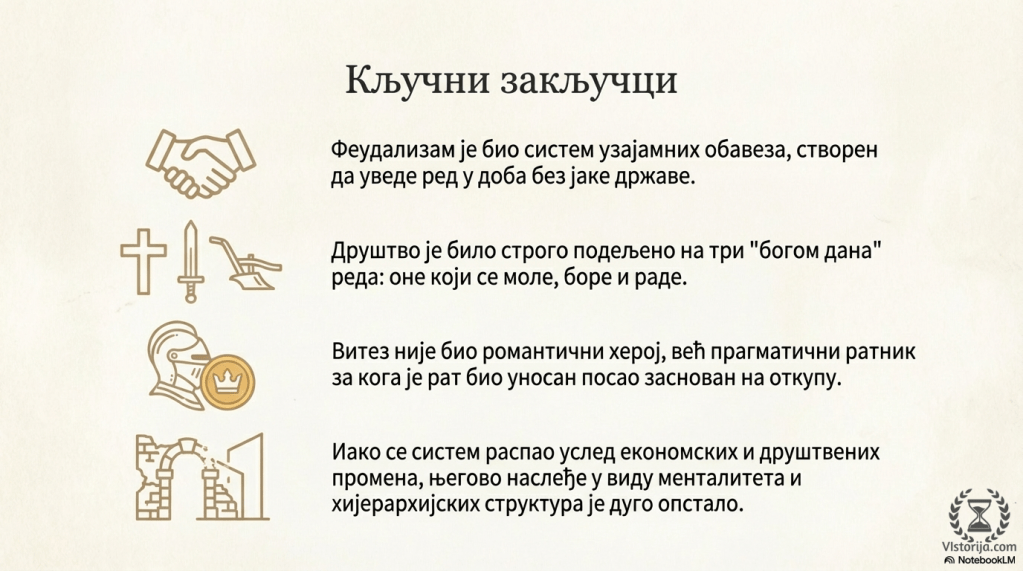 „Феудализам је био вид организовања друштва и стварања неопходног реда у једно доба када није постојала државна власт и кад чак није постојао ни појам „држава“. Заснивао се на врло сложеној и бујној мрежи личних везивања, запечаћених доживотним заклетвама.