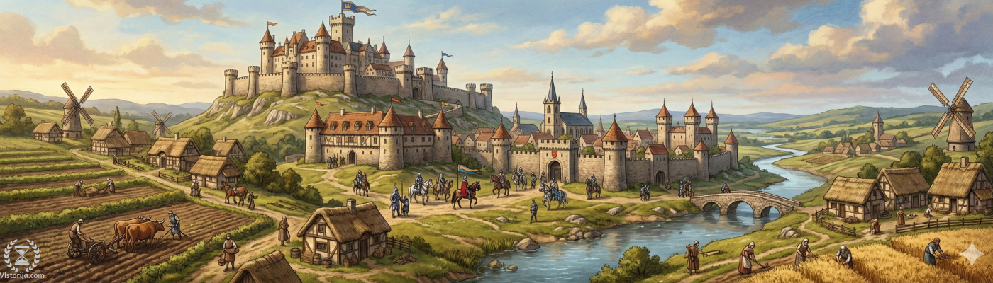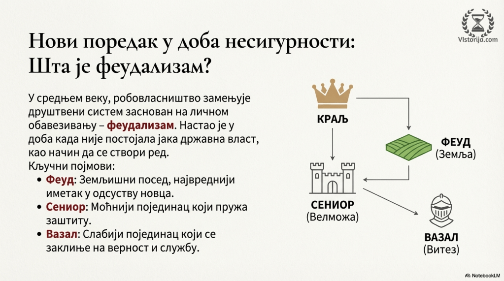 Друштвени систем карактеристичан за стари век – робовласништво, у средњем веку је заменио феудализам. Назив је добио по феуду – земљишњем поседу који је господар уступао поданицима као награду за верну службу. У одсуству новца земљишњи поседи били су највреднији иметак.На имањима су радили зависни сељаци – кметови, који су били обавезни да за уступљену земљу власницима, феудалцима, дају део производа и пружају им друге услуге. Односи између племића и владара, као и између држава, били су регулисани успостављањем вазалних односа. Моћнији појединац (сениор – на латинском “старији”) би узимао у заштиту слабијег (вазал – старолатински vassalus од келтског vassus – слуга), који му се заклињао на верност. Верност (Богу, цркви, феудалном господару) је у средњем веку била најважнија хришћанска врлина. Верни вазали су служили своје сениоре, а они су им пружали заштиту. У немирна времена грађанских ратова и најезда варвара нико није могао бити сигуран уколико није имао заштиту.