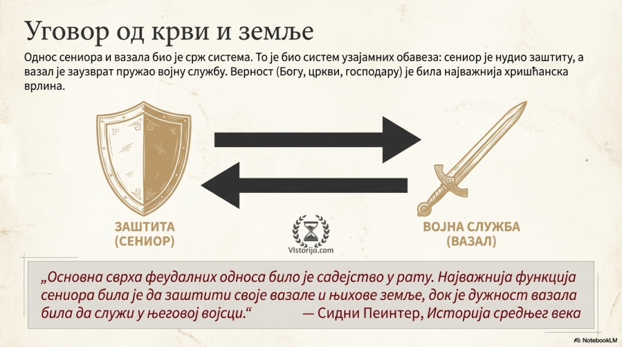 […] копљем, мачем и бојном секиром. Основна сврха феудалних односа било је садејство у рату. Најважнија функција сениора […]