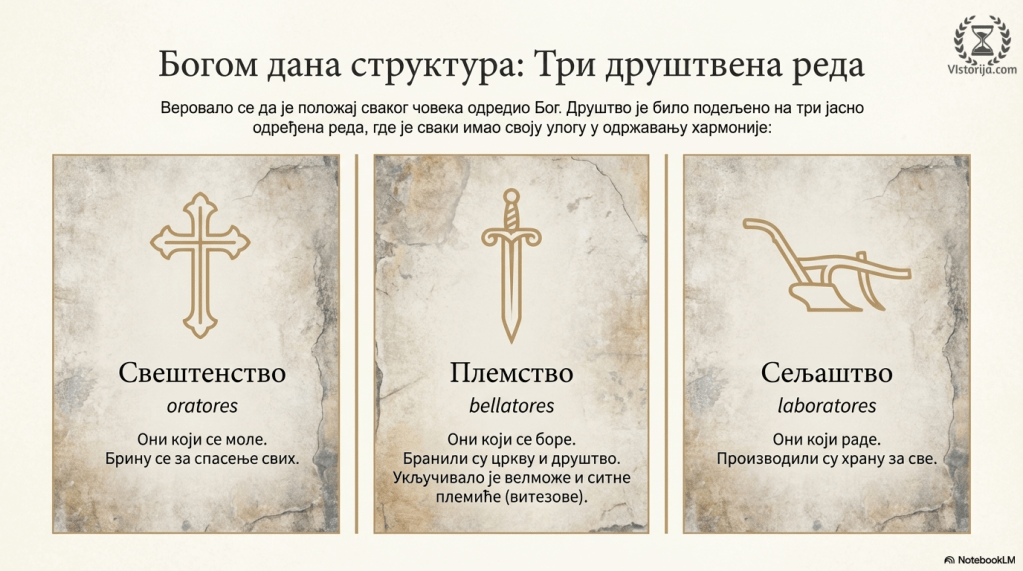 Веровало се да је положај сваког човека одредио Бог и да је дужност свакога да буде задовољан улогом која му је одређена и морао је да се понаша по утврђеном сценарију. Друштвене класе су имале јасно одређене улоге у друштву: свештенство је служило Богу и бринуло се за спасење људи, племство је бранило цркву и друштво од непријатеља, а сељаштво производило храну за све. Нарушавање тог хармоничног узајамног деловања прети последицама које су погубне за читав организам. Владајући сталежи су утицали на сељаке да у њиховој свести учврсте мисао о нужности покоравања судбини. Свештеничка проповед и религиозна литургија били су моћна средства за социјалну контролу понашања угњетених. Народу је објашњавано да се виша сила брине о њима, о њиховом спасењу и вечном животу и да их кажњава за грешан живот шаљући им болести, природне непогоде и сурове владаре.