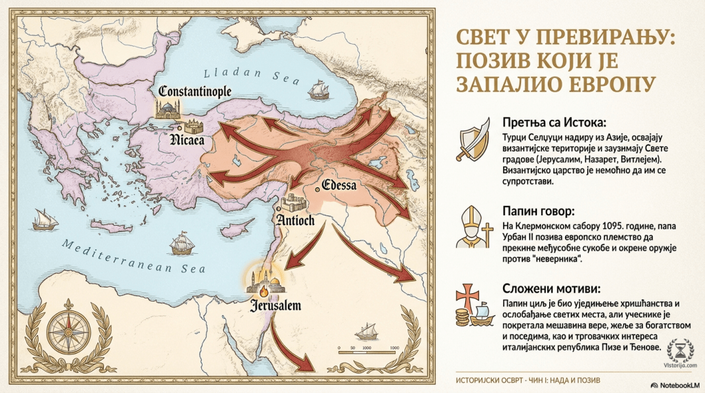 Први крсташки рат пада у сам крај XI века, када Турци Селџуци надиру из унутрашњости Азије према Западу. Византијско царство није било у стању да им се супротстави и они са лакоћом освајају византијске територије и заузимају Свете градове у Палестини (Јерусалим, Назарет, Витлејем). Папа Урбан II је на чувеном Клермонском сабору 1095. године позвао хришћанско племство Европе да престане са међусобним сукобима и окрене своје мачеве против муслимана, неверника, како би се ослободили свети градови. Папином позиву су се одазвали угледни европски племићи. Крсташком походу су се на располагање ставили Пиза и Ђенова – моћне италијанске поморске републике које су виделе свој трговачки интерес на Истоку.