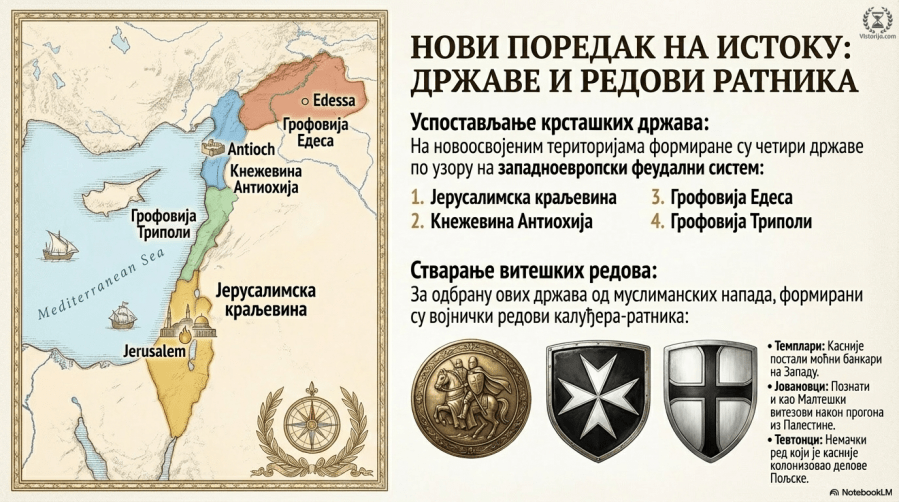 „Убрзо након Првог крсташког рата, на почетку XII века, основан је у новом хришћанском краљевству у Јерусалиму „витешки ред“ калуђера војника са мисијом да негују рањенике и истовремено да увек буду спремни да узму оружје и боре се против „пагана“, „неверника“, односно против муслимана. Зваће се Ред Светог Јована из Јерусалима (већином састављен од Француза). Након овог реда појавиће се и други, од којих треба да запамтите темпларе, који ће на Западу постати велики банкари, и тевтонске витезове (односно немачки ред), који су после напуштања Палестине […] колонизовали северни део Пољске, стварајући широку енклаву око луке Данциг (Гдањск), којим ће, под именом Источна Пруска, Немци владати до наших дана, до немачке пропасти у Другом светском рату. Након прогона из Палестине, на крају XIII века, јовановци ће се настанити прво на Кипру, затим на Родосу и на крају, у XIV веку, протерани од Турака Османлија, на Малти. Од тада су познати под именом малтешких витезова.“