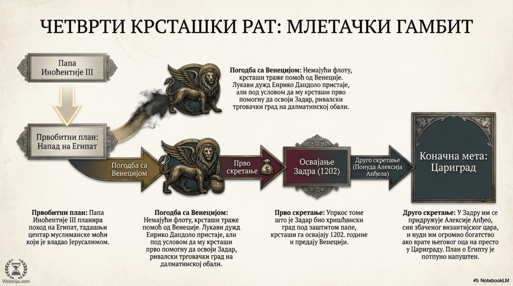 Чувени папа Иноћентије III је од почетка свог понтификата (1198-1216) планирао један крсташки рат са циљем да уздигне значај цркве и учврсти утицај папства. Крсташи су намеравали да задају ударац главној држави Истока – Египту, који је владао Јерусалимом. Немајући новца ни флоте да се пребаце у Египат, они су се обратили за помоћ Венецији. Лукави млетачки дужд Енрико Дандоло је успео да преусмери крсташки поход, убедивши италијанске и француске ритере да одустану од напада на Египат и помогну Венецији да освоји град Задар на далматинској обали. Иако је Задар био католички, под влашћу мађарског краља и заштитом папе, крсташи су га освојили 1202. године и предали Венецији. Затим је Енрико Дандоло предложио крсташима нов подухват. Наиме, у Задру се крсташима за помоћ обратио Алексије Анђео, син збаченог византијског цара Исака II Анђела, и понудио им огромне новчане своте да му помогну у враћању његовог оца на престо. Крсташи су на то пристали и кренули пут Византије, где су заиста вратили на власт Исака II.