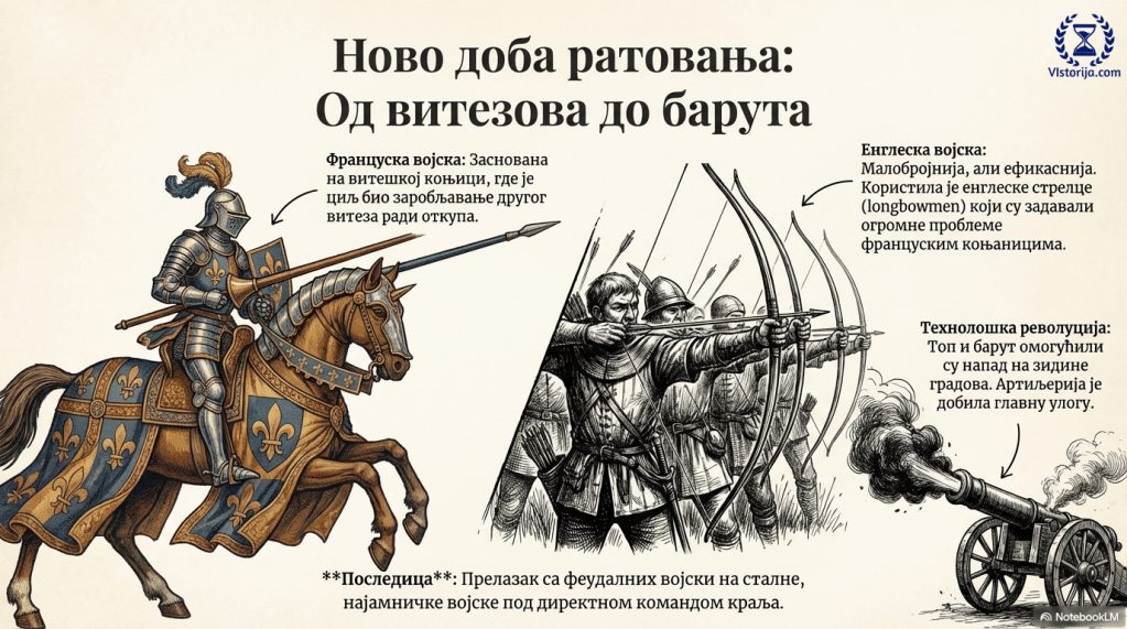 Француска војска је била витешка (циљ добити откуп за заробљеног витеза), а малобројнија енглеска је настојала побити што више непријатељских војника. Енглески стрелци су задавали проблеме француским коњаницима. Током овог рата дошло је до преласка са старих средњовековних феудалних војски витезова на најамничку сталну војску. Променом начина ратовања смањује се зависност краљева од подршке најмоћнијих феудалаца. Стална војска под командом краља постаје ослонац његове власти. Монарси су тако постали апсолутни господари.