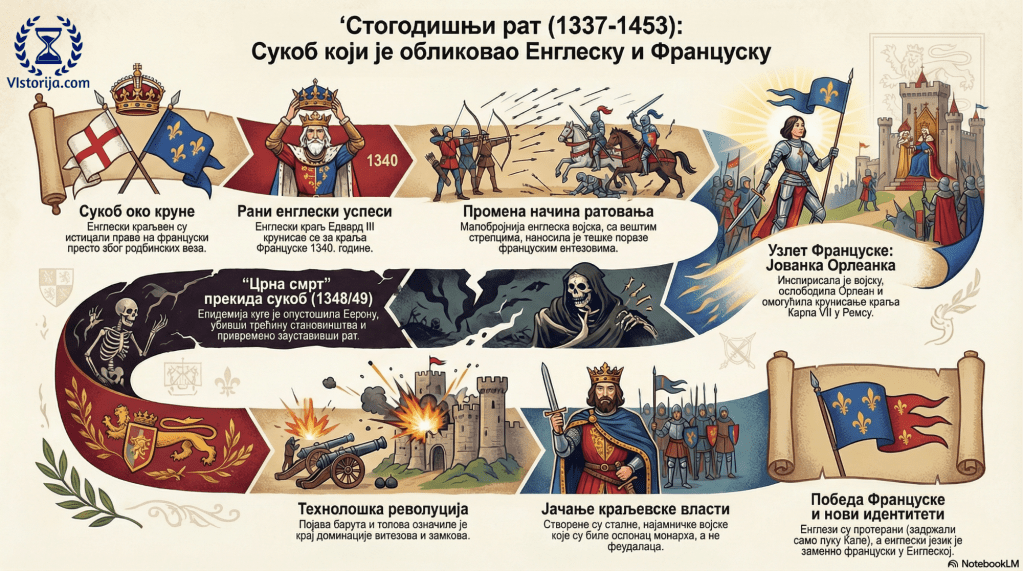 Енглески краљеви су због сродничких веза истицали право на наслеђе француског престола, а француски краљеви су настојали да одузму Енглезима територије у Француској. Сукоб се углавном водио на тлу Француске. Боље организовани Енглези су у почетку бележили успехе, па се енглески краљ Едвард III (1312-1377) крунисао краљем Француске 1340. године, јер је његова мајка била сестра претходног француског краља (Филипа IV Лепог).