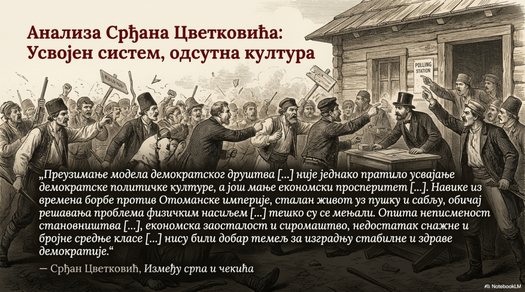 Оштре династичке сукобе Обреновића и Карађорђевића пратиле су чистке, прогони и пребијања а неретко и убиства политичких противника. Од шесторице владара у XIX веку, тројица су убијена (Карађорђе, Михаило и Александар Обреновић), док ниједан није легално завршио своју владавину. Преузимање модела демократског друштва у последњој четвртини XIX века и релативно рани настанак политичких странака није једнако пратило усвајање демократске политичке културе, а још мање економски просперитет и културна еманципација друштва. Навике из времена борбе против Отоманске империје, сталан живот уз пушку и сабљу, обичај решавања проблема физичким насиљем и обрачуном са политичким неистомишљеником тешко су се мењали. Општа неписменост становништва (више од 80% живело на селу од пољопривреде), економска заосталост и сиромаштво, недостатак снажне и бројне средње класе грађанства нису били добар темељ за изградњу стабилне и здраве демократије. Поједини окрузи у Србији су још увек крајем тог века имали озбиљне проблеме са хајдучијом. Политички систем је био усвојен, а друштвени предуслови за демократизацију друштва били су далеко од испуњења што се није битније променило ни до Другог светског рата.“