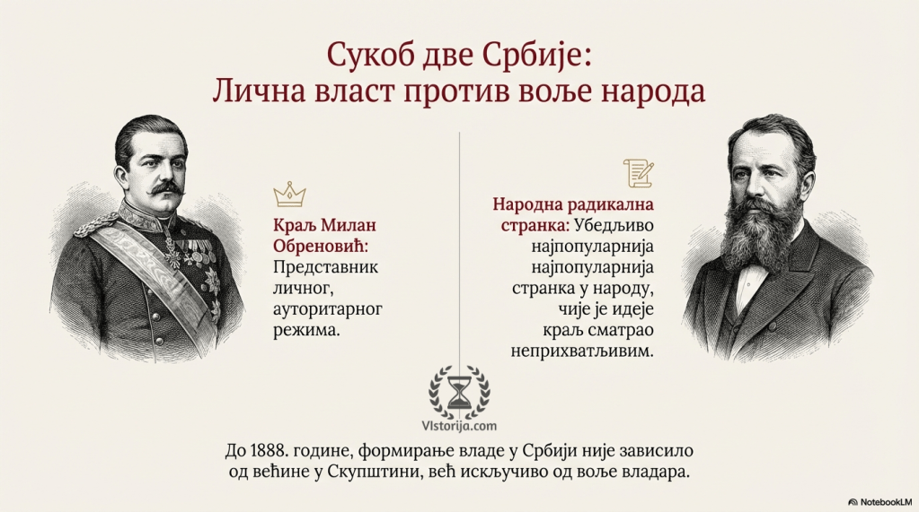 Формирање владе у Србији све до Устава из 1888. године није зависило од подршке већине у Народној скупштини, односно од избора народа, него од воље владара. Оснивање политичких странака законом је дозвољено 1881. године. Убедљиво највећу популарност у народу имала је Народна радикална странка, која за краља Милана Обреновића није била прихватљива са својим радикалним идејама, па им није давао мандат за састављање владе. Врхунац сукоба краља Милана и радикала представљала је Тимочка буна (1883). Отпор народа краљ је угушио војском. Његова моћ је била у зениту. Вође радикала су осуђене на дуготрајне робије или смртне казне, због чега су многи побегли из земље. Уточиште које им је пружила Бугарска је био један од повода за Српско-бугарски рат 1885. године. Након пораза у рату, углед краља Милана је био пољуљан. Спремао се за повлачење са власти. У склопу тих припрема је покренуо питање новог устава.