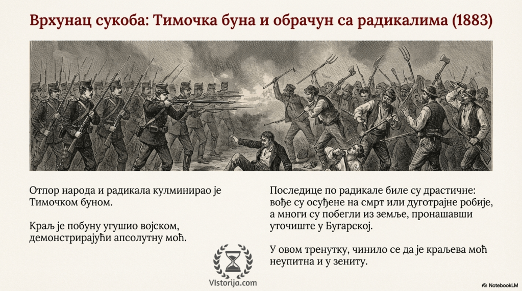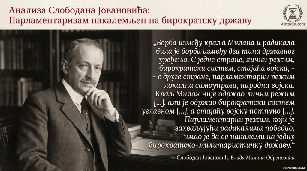 „Борба између краља Милана и радикала била је борба између два типа државног уређења. С једне стране, лични режим, бирократски систем, стајаћа војска, – с друге стране, парламентарни режим локална самоуправа, народна војска. Краљ Милан није одржао лични режим [уведен је парламентаризам 1888. уставом], али је одржао бирократски систем углавном [уставом од 1888. године је уведена локална самоуправа, али подељена између народних представника и државних чиновника], а стајаћу војску потпуно [решено још гушењем Тимочке буне]. Парламентарни режим, који је захваљујући радикалима победио, имао је да се накалеми на једну бирократско-милитаристичку државу.“