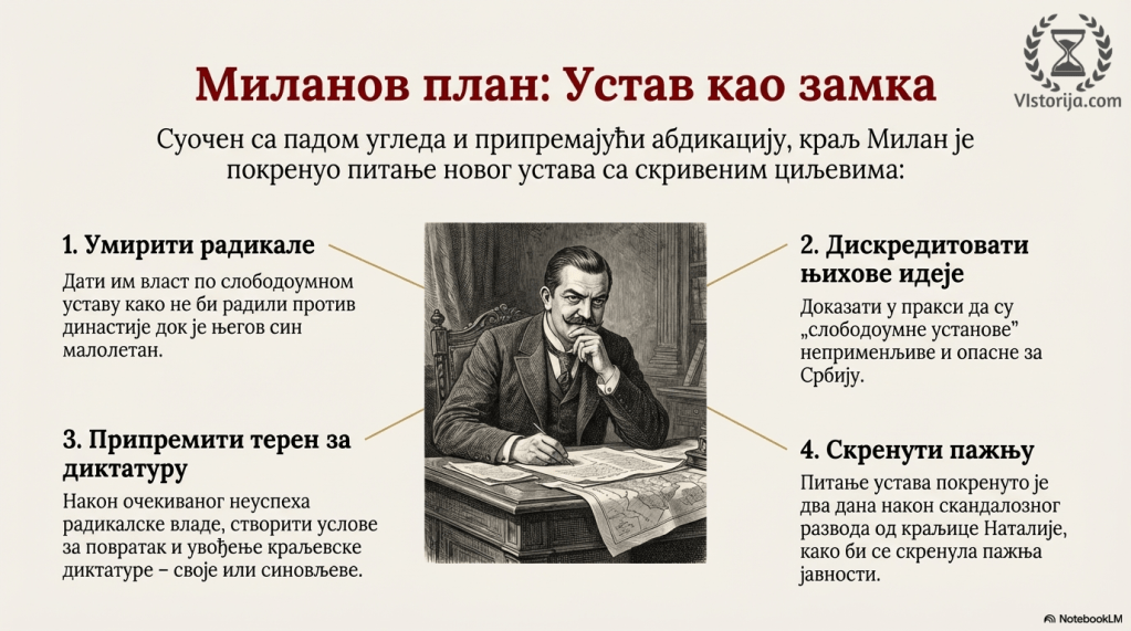По уверењу краља Милана устав је био претерано слободоуман и по њему се није могло владати. Требало је да умири радикале до пунолетства краља Александра. Након тога је Милан предвиђао безвлашће и свој повратак на престо са диктаторском влашћу (као што се десило након абдикације кнеза Милоша, пола века раније). Устав је требало да докаже непрактичност идеја радикала и утре пут краљевској диктатури, или Александра или Милана.