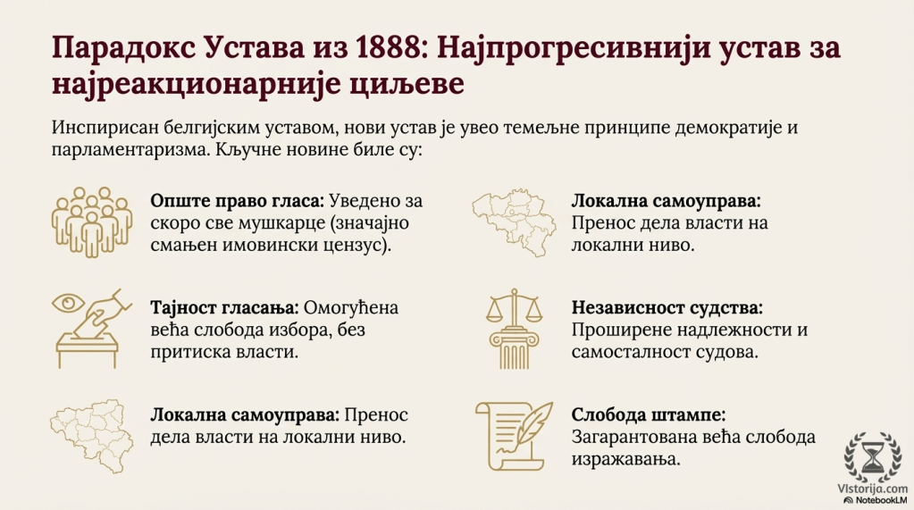 Краљ Милан Обреновић је успео да окупи представнике све три политичке странке да се договоре (компромисно) око новог устава. Почивао је на принципима демократије и парламентаризма. Уведено је скоро опште право гласа за све мушкарце (до тада је постојао већи имовински цензус). Уведена је тајност гласања, што је омогућило већу слободу избора. С циљем да народни посланици буду стручнији, уведена је одредба по којој су из сваког округа бирана по два посланика са факултетском дипломом. Посланици су морали бити старији од 30 година. Уведена је локална самоуправа. Проширене су независност судства и слобода штампе.