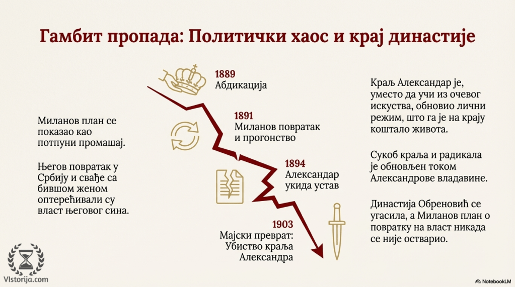 Каснију Александрову владавину обележиће политичка нестабилност. Обновиће лични режим у Србији, што ће га на крају коштати живота. Током Александрове владавине Милан Обреновић се вратио у Србију, али је својом свађом са бившом женом оптерећивао власт сина, те је морао да напусти земљу, приликом чега се одрекао држављанства за новчану надокнаду (1891). Затим се незаконито опет вратио у Србију и чак је постављен за команданта војске. Србију је Милан Обреновић коначно напустио наљутивши се на сина због његове изабранице. Умро је и сахрањен у иностранству – у Аустроугарској, на коју се ослањао током владавине (што је био један од разлога сукоба са радикалима, који су се и после разочарења 1878. уздали у Русију). Сукоб краља и радикала је обновљен током Александрове владавине, а окончан њиховом владавином у периоду након његовог убиства (1903), када је обновљена парламентарна демократија. Тада су се радикали поделили у две странке и сукобљавали се међусобно (без озбиљне конкуренције других странака). Таква ситуација је потрајала до краја постојања Краљевине Србије (1918).