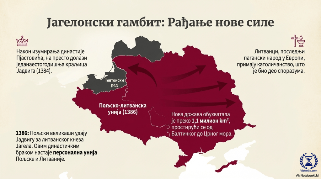 Након изумирања династије Пјастовића, престо је наследио угарски краљ Лајош (1370-1382) из династије Анжујаца. Њега је 1384. године наследила једанаестогодишња ћерка Јадвига, коју су великаши који су тада управљали Пољском 1386. године удали за литванског кнеза Јагела. Династија њихових потомака Јагелонаца је владала до 1569. године. Династичким браком Пољска и Литванија су биле уједињене у персоналну унију (заједница држава са истим владаром). Била је слаба, јер је Литванија тежила да очува самосталност, али је, ипак, довела до јачања Пољске. Обухватала је велику територију од преко 1,1 милион квадратних километара, која се простирала од Балтичког до Црног мора. Литванци су били последњи пагански народ у Европи, који је хришћанство примило због савеза са Пољацима, који су били католици. Унија Пољске и Литваније је разним споразумима опстала све до краја XVIII века.