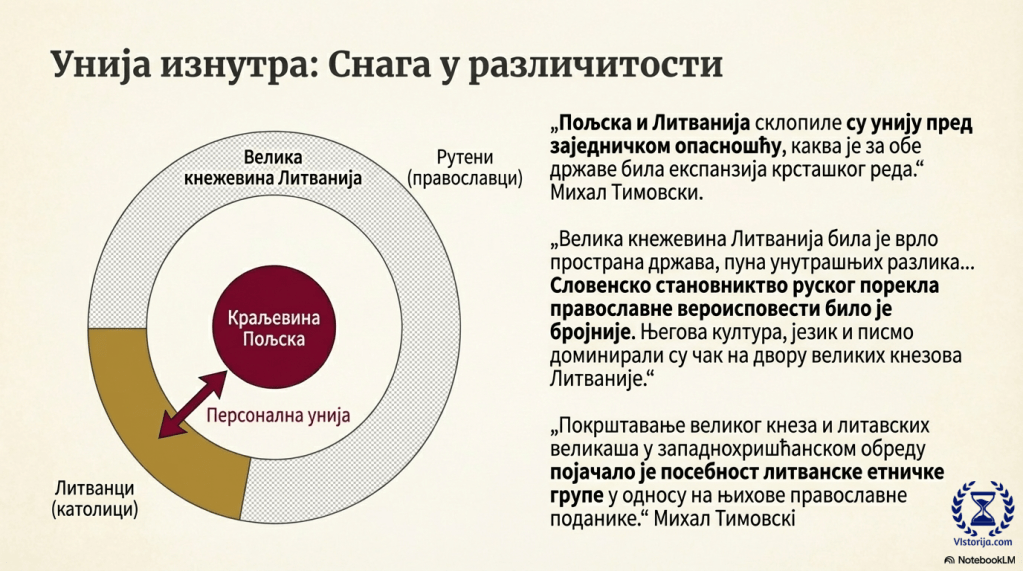 „Пољска и Литванија склопиле су унију пред заједничком опасношћу, каква је за обе државе била експанзија крсташког реда. Велика кнежевина Литванија била је врло пространа држава, пуна унутрашњих разлика. Сами су Литванци били у њој релативно малобројни и насељавали су северозападни део кнежевине. На истоку и југу налазила су се подручја руских кнежевина, које је Литванија заузела потискујући Монголе. Словенско становништво руског порекла православне вероисповести било је бројније. Његова култура, језик и писмо доминирали су чак на двору великих кнезова Литваније. Покрштавање великог кнеза и литавских великаша у западнохришћанском обреду појачало је посебност литванске етничке групе у односу на њихове православне поданике.“