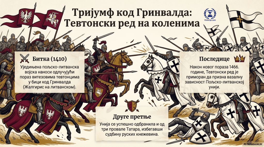 У следећем веку Пољско-литванска унија се одбранила од витезова тевтонаца. У бици код Гринвалда (у преводу са немачког на литвански: Жалгирис) пољско-литванска војска је поразила тевтонски ред 1410. године. Након новог пораза 1466. тевтонски витезови су признали вазалну зависност Пољско-литванској унији.