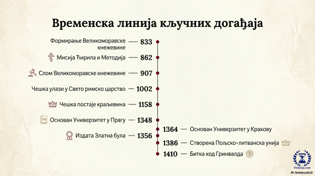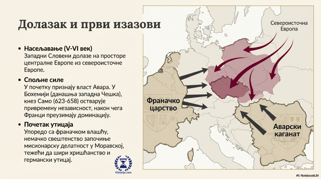 Западни Словени су на простор на којем данас живе дошли из североисточне Европе у V и VI веку. Признавали су власт Авара до 623. године. Бохемија (данашња западна Чешка) је постала независна од Авара за време кнеза Сама (623-658), након чије смрти су Франци завладали тим простором. Од тога времена немачко свештенство је почело своју мисионарску делатност у Моравској (данашња источна Чешка), тежећи да је христијанизује и понемчи.