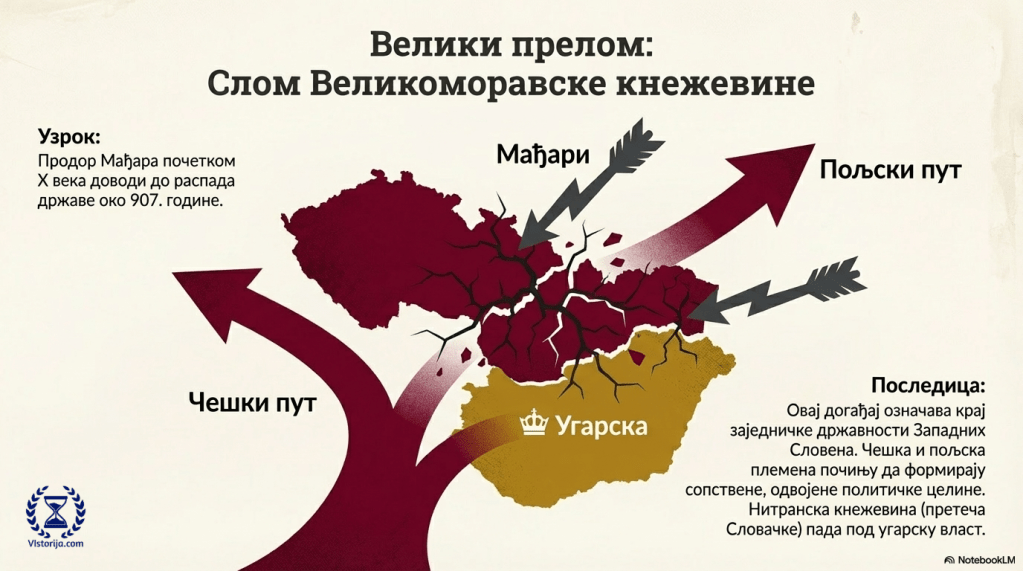 „До деветог века сви кључни елементи у централној Европи били су на свом месту. Пролазна Великоморавска кнежевина била је словенска конфедерација, која је успевала да буде и дубоко важна и фрустрирајуће магловита – није чак јасно ни којим земљама је она владала, иако је прилично сигурно да је укључивала модерну моравску област и Словачку и вероватно круг земаља око тог језгра. Чешки националисти су се бескрајно расправљали око тога. Она је трајала само неколико деценија, али је била културно пресудна као дом првог лепог и чудног глагољичког писма […] а затим, захваљујући неуморним византијским мисионарима Ћирилу и Методију, и као дом првог словенског писма – одлука о писму је од тада увек одлучујуће исцртавала другачије зоне, и за себе, и као означитељ привржености православљу. Уистину, мисионарски рад овог периода на померању великих делова становника Европе ка Константинопољу и ван домашаја Рима, створио је трусно подручје с импликацијама које сежу све до данашњих дана.“