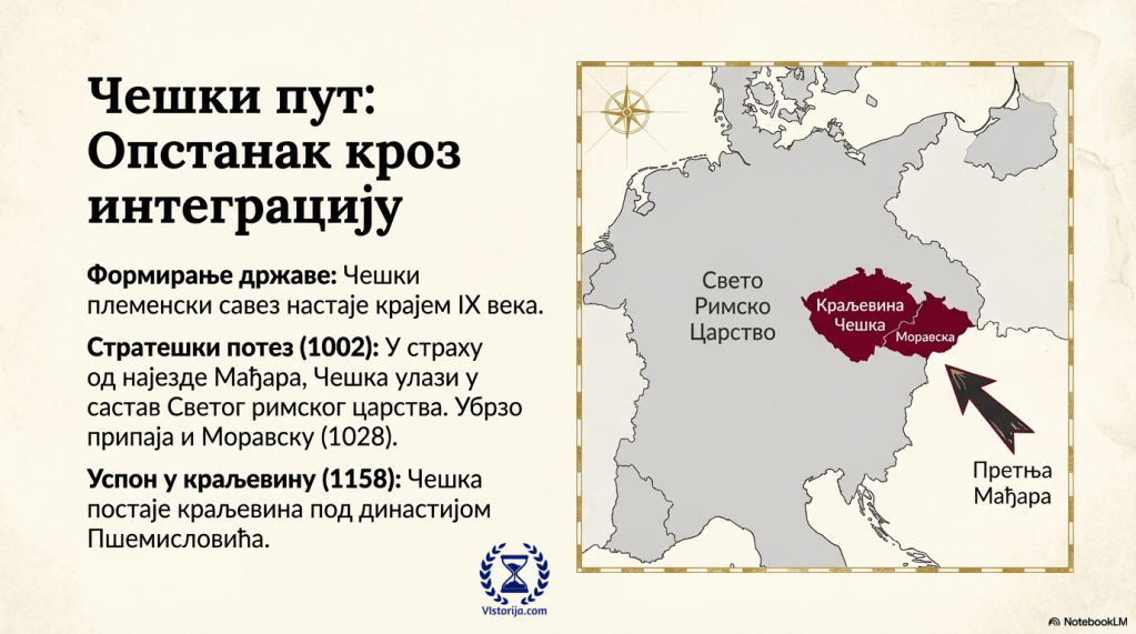 Kрајем IX века настаo je чешки племенски савез. Почетком XI века Чешка је, у страху од најезде Мађара, ушла у састав Светог римског царства немачког народа (1002) и припојила Моравску (1028). Средином XII века (1158) Чешка је постала краљевина са династијом Пшемисловић. Почетком XIV века династија Пшемисловића је изумрла, а наследила ју је династија Луксембург.