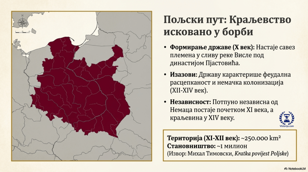 „Територија Пољске у 11. и почетком 12. века износила је око 250 хиљада километара квадратних, а број становника око једног милиона.“
