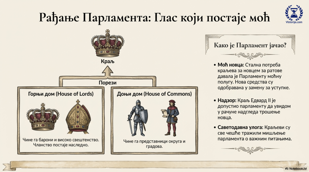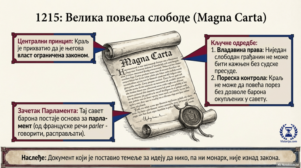 Краљ је прихватио да је његова власт ограничена законом. Ниједан слободан грађанин није могао бити кажњен без судске пресуде. Краљ није могао да повећа порез без дозволе барона окупљених у парламенту (место где се разговара или расправља). Почетком XIV века у парламенту су се издвојили Горњи дом, који су чинили барони и Доњи дом, који су чинили представници округа и градова. Чланство у Горњем дому је постајало наследно. Црквени људи полако су се повукли из парламента.