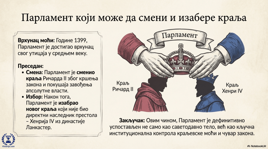 Парламент је 1399. године сменио краља Ричарда II (1377-1399) због кршења закона у намери да заведе своју неограничену власт. Након тога парламент је изабрао краља који није био правни наследник престола – Хенрија IV (1399-1413) из нове династије Ланкастера.