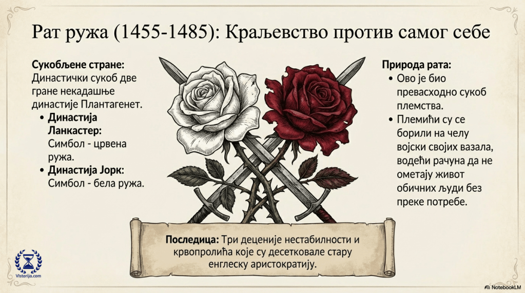 Од 1455. до 1485. године трајао је сукоб династија Ланкастер (симбол црвена ружа) и Јорк (симбол бела ружа) око власти. Обе фамилије су били огранци некадашње династије Плантагенет. У рату су се борили племићи на челу војски својих вазала, водећи рачуна да не ометају живот обичних људи без преке потребе.