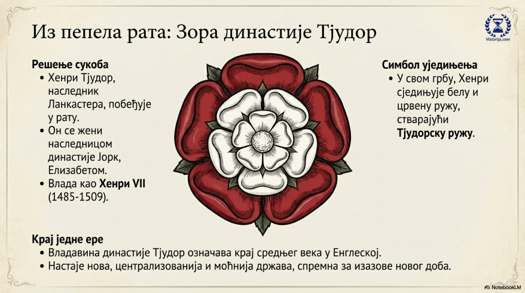 Након сукоба Енглеском је завладала династија Тјудор. Хенри Тјудор је био наследник Ланкастера, који се оженио наследницом Јорка. У свом грбу је сјединио белу и црвену ружу. Владао је као Хенри VII (1485-1509).