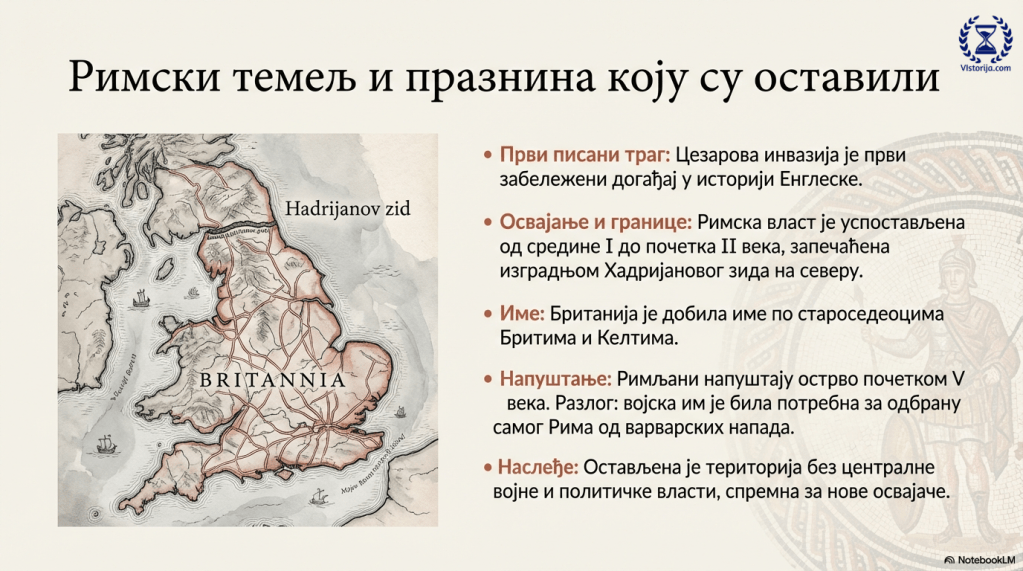 Још за време римске власти, а и после, Британију су нападали Пикти са севера, Ирци са запада и германски народи са истока и југа. Британију су од 5. века постепено освајали германски народи Англи и Саксонци (из северозападног дела Немачке), Јити (из Данске) и Фризи (из данашње Холандије, Белгије и Луксембурга). По Англима је названа Енглеска (“земља Англа”).