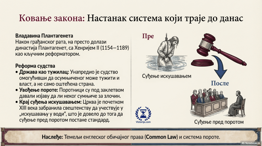 Хенри I (1100-1135) је слао своје судије по краљевству како би становници могли да се жале краљу. Хенри II (1154—1189) је учврстио краљевску власт. Унапредио је судство, омогућивши да осумњиченог за злочин може тужити и власт, а не само оштећени, његови рођаци и пријатељи. До ове реформе многи злочинци су остајали некажњени, ако нико не би уместо жртве поднео пријаву. Увео је и пороту. Поротници су под заклетвом давали изјаву да ли неког из њиховог краја сумњиче за неки злочин. Оптуженима је суђено искушавањем у води – оптужени су после одређених верских обреда везаних руку и ногу бацани у воду, у складу са веровањем да освештaна вода неће примити невиног човека и да ће такав остати да плута. Краљ Хенри II је међутим додао и да ако 12 поротника остане при тврдњи да је оптужени крив, он мора бити прогнан. Држава је одузимала имовину осуђених. Тако је побољшан јавни ред и увећани краљеви приходи. Искушавање у води је укинуто почетком XIII века, када је црква забранила свештенству да учествује у томе. Тако је суђење пред поротом временом у потпуности заменило суђење искушавањем у води.