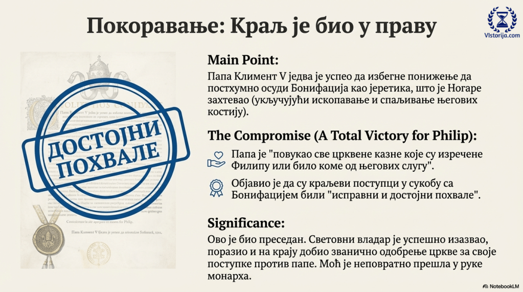 Климент је једва успео да избегне понижење да осуди папу Бонифација који је био у сукобу са краљем Филипом. Ногаре је тражио да се папине кости ископају из земље и јавно спале, али се на крају завршило са тиме што је папа „повукао све црквене казне које су изречене Филипу или било оме од његових слугу у вези с догађајима и објавио да су краљеви поступци били исправни и достојни похвале.