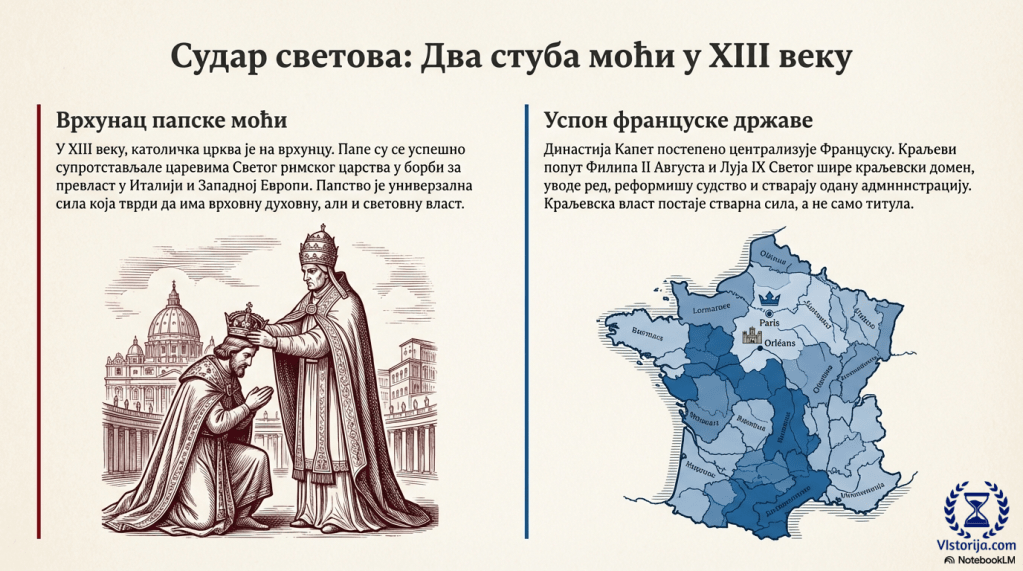 Моћ католичке цркве достигла је врхунац у XIII веку, када су се папа успешно супротставиле царевима у борби за превласт у Италији и Западној Европи. Али, крајем XIII и у XIV веку папе су постале зависне од краљева Француске, након сукоба са француским краљем Филипом IV (1285-1314) због његове намере да опорезује свештенство у Француској.