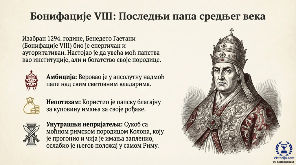 „Почетком своје владавине, дао је свом синовцу новац из папске благајне да купи неко драгоцено имање. Породица Колона, која је и сама желела то имање, преотела је пошиљку са новцем за куповину и склонила отето благо у једно од својих упоришта. Бонифације је одмах прогласио крсташки поход против Колона, заузео њихове замкове, поделио њихове земље својим рођацима, а припаднике њихове куће је прогнао или позатварао. На тај начин стекао је мноштво непријатеља међу римским племством. Пошто је тако ослабио свој положај у својој земљи, лакоумно се упустио у сукоб са двојицом најмоћнијих владара у Западној Европи.