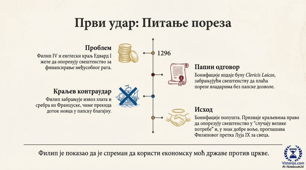 Француски краљ Филип IV и енглески краљ Едвард I припремали су се 1295. године за рат око војводства Гаскоње и намеравали су да дођу до неопходних средстава опорезивањем свештенства у својим земљама. Бонифације је на то 1296. године издао булу Clericis Laicos, којом је свештенству у свим државама забрањивано да без сагласности папе плаћају порезе владарима. Краљ Филип је одмах ставио забрану на извоз злата и сребра из свог краљевства, чиме је прекинуо претицање новца на папски двор. Овај први судар, Бонифација је брзо уразумио. Признао је краљевима право да опорезују свештенство у случају велике потребе, али и да сами одређују колике су то потребе. Како би у потпуности исказао своју наклоност француској монархији, Бонифације је прогласио Луја IX за свеца. Међутим, слози између краља Филипа Бонифација убрзо је дошао крај.