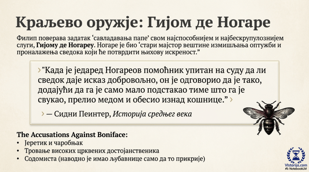 „Филип се ослонио на услуге једне посебно занимљиве личности по имену Гијом де Ногаре, који је био стари мајстор вештине измишљања оптужи и проналажења сведока који ће потврдити њихову искреност. На пример када је једном краљ посумњао да га поткрада епископ Троа, који је био задужен за прикупљање прихода у грофовији Шампањи, упутио је тамо Ногареа. Ногаре је, на своје и краљево задовољство, изнео и доказао да је епископ сковао заверу са једном вештицом у намери да убије краљицу забадањем чиоди у њену слику и да је починио разне друге злочине. Када је једаред Ногареов помоћник упитан на суду да ли сведок ког је довео даје исказ потпуно добровољно, он је одговорио да је тако, додајући да га је саmо мало подстакао тиме што га је свукао, прелио медом и обесио изнад кошнице. Таквом домишљатом и оданом слуги Филип је поверио задатак да савлада папу Бонифација. Ногаре је почео са већ уобичајеним писком оптужби. Бонифације је оптужен за јеретика и чаробњака који је дубока загазио у црну магију. Наводно је отровао известан број високих црквених достојанственика. Можда најмаштовитија у дугом писку оптужби јесте изјава сведока да је Бонифације имао љубавнице да би прикрио чињеницу да је содомиста. Пошто је прикупио доказе за своје оптужбе, Ногаре је кренуо у Италију у друштву једног од непомирљивих Бонфацијевих непријатеља, Скјара Колоне. У околини Рима они су окупили нешто присталица породице Колона као и већи број обичних разбојника и кренуо на Ањани, где је Бонифације одсео код својих рођака. Ова скупина очајника напала је град, 7. септембра 1303. године, и заробила старог папу. Иако су племићи из околине брзо натерали Ногареа да ослободи папу, претрпљени страх и понижење били су превише за Бонифација и он је убрзо умро.“
